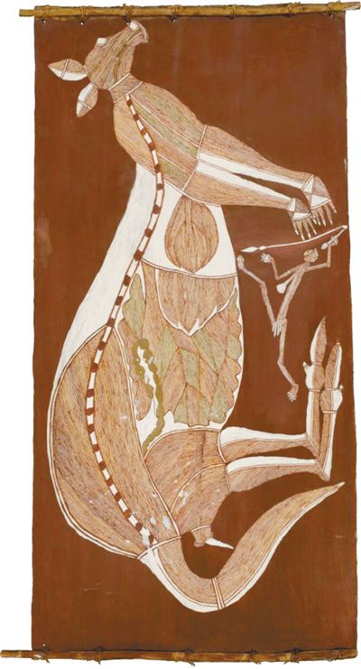 得益于延續(xù)幾千年的歷史和人文傳統(tǒng),澳大利亞樹皮畫帶有強(qiáng)烈的原始藝術(shù)趣味。古老的巖畫藝術(shù)、漫長(zhǎng)的土著文化等,滋養(yǎng)著樹皮畫的發(fā)展。在取材用料上,20世紀(jì)的澳洲樹皮畫創(chuàng)作,依然保持了土著藝術(shù)的“原汁原味”。以桉樹皮為畫布,以赭石等礦物質(zhì)為顏料。繪畫工具簡(jiǎn)單便利,多是在細(xì)木棒一端固定上細(xì)長(zhǎng)毛發(fā)制作而成,正是這種特殊的畫筆,使得樹皮畫在藝術(shù)形式上呈現(xiàn)出以線條表現(xiàn)為主的特色。粗細(xì)不均、長(zhǎng)短不一、彎直各異的線條,經(jīng)土著“大師”們的巧妙組合、排布,再配合上平涂的點(diǎn)、面,一幅幅形象生動(dòng)的繪畫便躍然于樹皮之上。