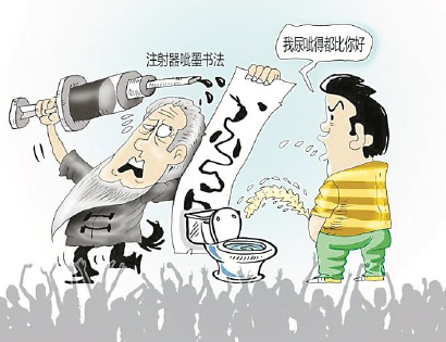 比如“射書”,即用灌滿墨汁的針管在宣紙上射出道道墨跡(視頻顯示,宣紙由幾位美女手提橫展,書者邁著太極步,突然作一溜煙小步奔跑狀,同時用幾支針管射出墨汁);“吼書”,顧名思義就是邊吼叫邊書寫,書者十分亢奮,類似耍酒瘋。只是,書寫地點恐怕要找個僻靜無人之地,否則一定 “擾民”;“鼻書”,即在鼻孔里插兩支毛筆俯紙而書,容易引人產生不太衛生的聯想;“左右開弓或手腳并用多管齊下書”(無須解釋了);“雙人倒抱美女垂發蘸墨書”,只見倒懸的美女滿臉墨汁,花容失色,一頭烏發成了掃地的拖把。還有什么 “刀書”“溺水書”“盲書”“塑料瓶蓋穿孔書”“洗車噴頭書”等等,簡直古靈精怪,無奇不有。更有甚者,還走出了國門,在威尼斯眾目睽睽之下表演 “女下體書”,且使用書法很忌諱的大紅墨。