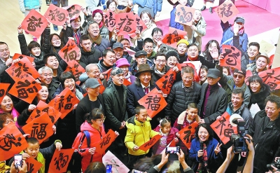 現場送“福”活動持續了一個小時,就在領到福字的觀眾意猶未盡之時,中國美術館的工作人員告訴大家,北京晚報的記者還要給大家拍攝一張“全家福”。觀眾們很快將吳為山館長、燕東升書記和藝術家們簇擁在一起,高舉起手中的福字,記者爬上二樓的走廊處,按下快門,拍下了這喜慶的時刻。