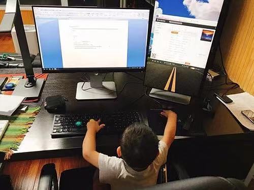 呂錚的兒子撓撓在呂錚寫作桌前“指點(diǎn)江山”