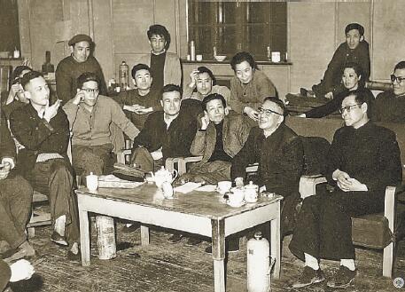 1963年4月2日,老舍(前排右二)觀看《茶館》排練后與演職人員交談 圖片由北京人藝戲劇博物館提供