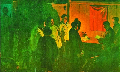 許寶中的《把一切獻給黨》描繪了英勇的前方戰士在戰壕中面對黨旗莊嚴宣誓的情景。畫家運用了明度較高的紅色刻畫黨旗,使之跳出畫面,成為作品的不二焦點。硝煙彌漫的遠處仍有戰士在用望遠鏡偵察敵情,緊張的氣氛撲面而來。參與宣誓的軍人有的手持槍械,有的甚至負傷在身,表情卻堅定而平靜,與周圍環境形成一靜一動的鮮明對比,從而突出了共產黨人信念的不可動搖。