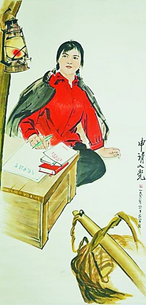 從50多人到近9000萬人,建黨以來黨員隊伍的不斷發展壯大彰顯了信仰的力量,加入中國共產黨成為一代又一代中國青年的矢志追求。梁巖的《申請入黨》是一幅極具巧思的作品。畫面上方的人物身著紅衣,正準備在紙上寫下入黨申請,下方的扁擔和籮筐暗示了主人公的身份。畫家特意讓人物的目光望向掛在高處的煤油燈,燈火象征著光明,也代表了追求進步的青年心中的信仰。