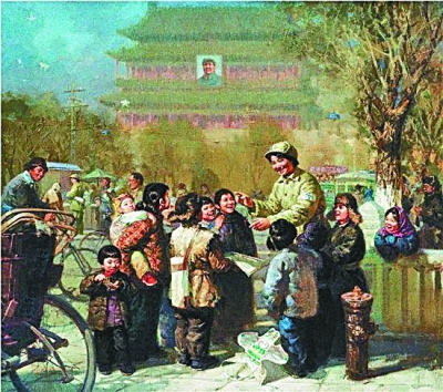 全心全意為人民服務是黨的宗旨。“為中國人民謀幸福、為中華民族謀復興”的中國共產黨得到了人民群眾的真心擁護與愛戴,這也是美術家們在創作中樂于表現的主題。張京生、王元珍的《沒有共產黨就沒有新中國》以群像的形式表達了人們對黨的謳歌與熱愛。作品所描繪的情節與內容均出自于作者的親身經歷。在剛剛迎來解放的北京街頭,一群孩子正在跟一位軍管會的女同志學習唱歌。遠處的城樓上懸掛著領袖的畫像,茂密的樹叢沐浴著溫暖的陽光,藍天映襯著飛翔的風箏,營造出歡快與祥和的氣氛。從孩子們極其投入的神情與滿面的笑容里,不難看出他們對新中國的憧憬與希望。