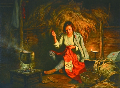 王忻的《永恒的信念——女紅軍》生動刻畫了一名正在油燈前縫制旗幟的女紅軍。人物身后的稻草和房間里堆砌的雜物顯示出戰爭年代生活環境的惡劣。在燈光的映照下,女紅軍面部的表情清晰細膩,專注的眼神閃爍著希望的光芒,傳遞出共產黨員堅定的理想信念。