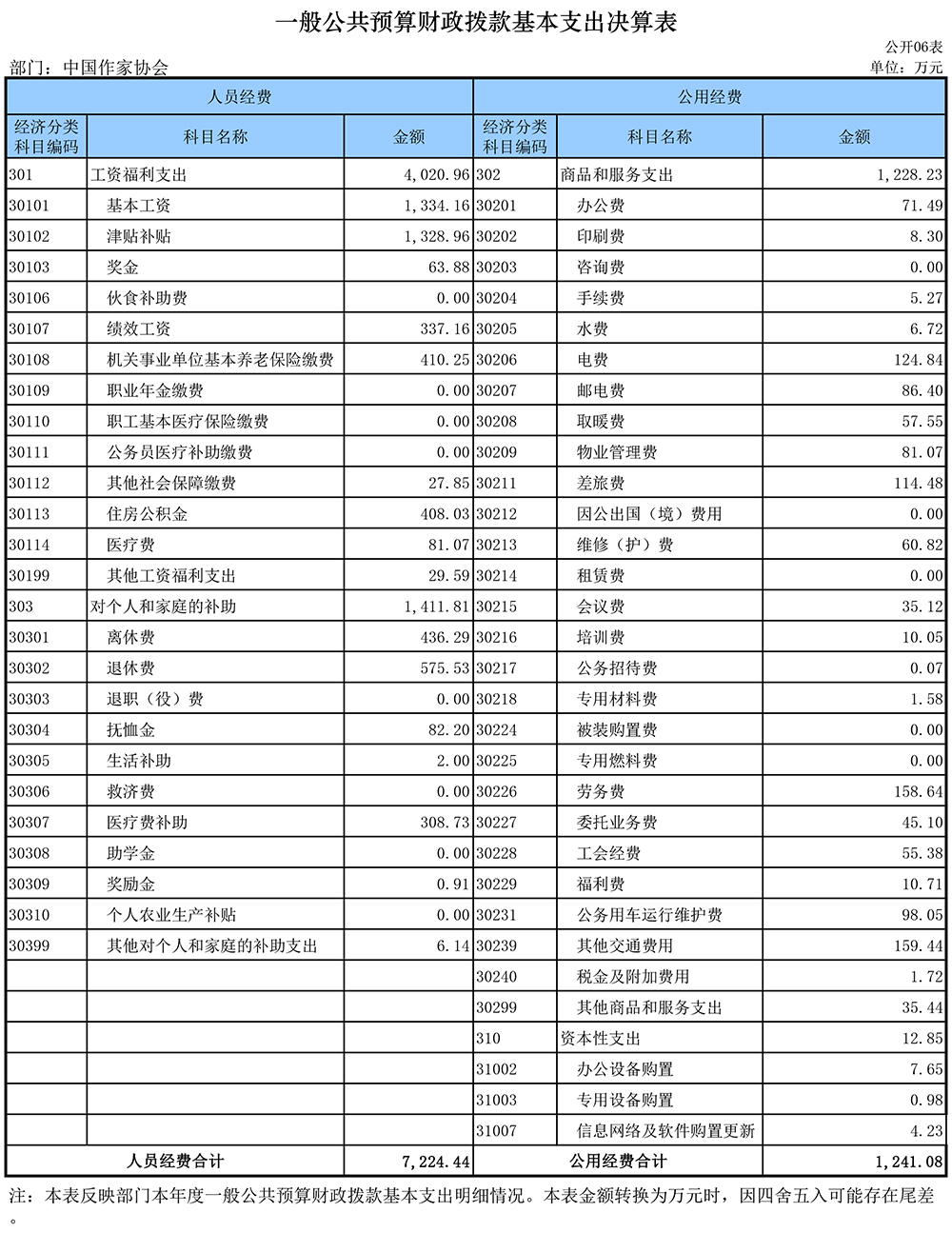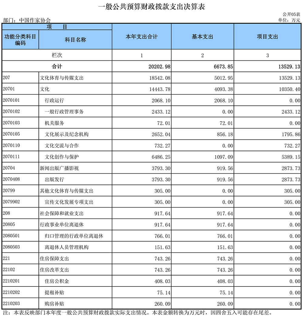 七、文化體育與傳媒(類)文化(款)行政運行(項):指中國作協本級行政人員工資及機構正常運轉、履行職責所需的基本支出。