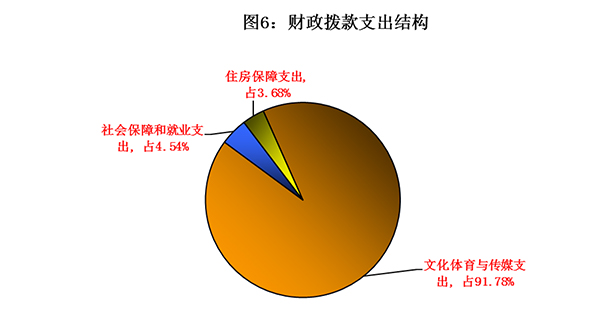 2018年度財政撥款支出20202.98萬元,主要用于以下方面:文化體育與傳媒(類)支出18542.08萬元,占91.78%;社會保障和就業(類)支出917.64萬元,占4.54%;住房保障(類)支出743.26萬元,占3.68%。