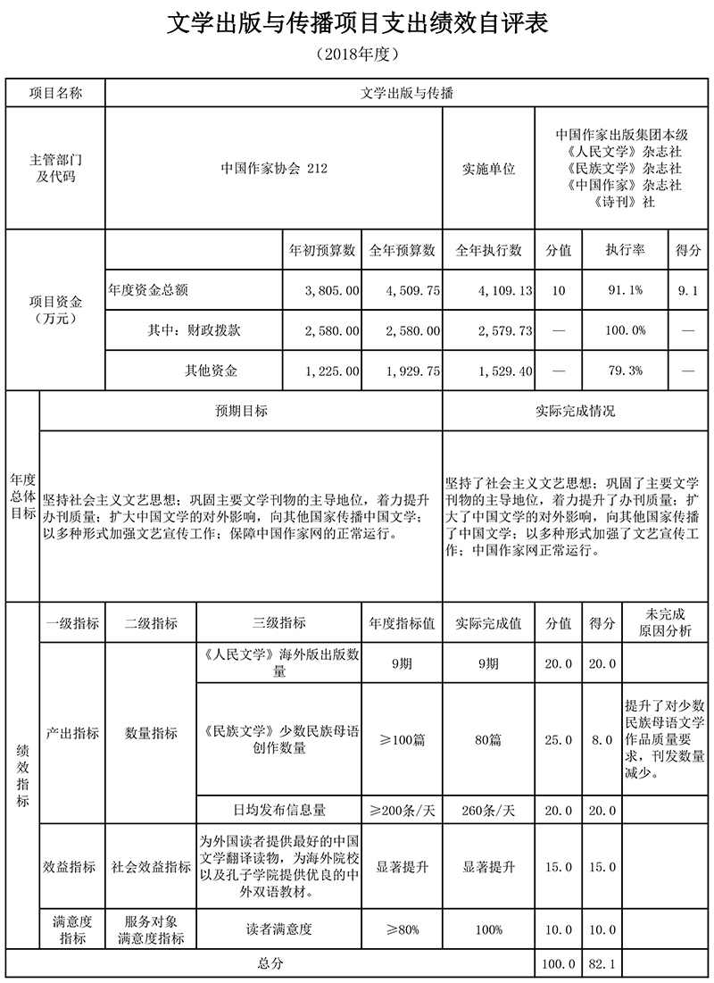 我會2018年在中央部門決算中反映“文學創作與研究”和“文學出版與傳播”兩個一級項目績效評價結果。