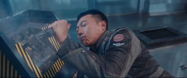 另外一個是,“末日戰場”背景下,保家衛國、勇于犧牲的英雄主義。電影通過幾個人物的犧牲來渲染。比如“捕食者”進入控制中心,妄圖拷貝總控制室計算機硬盤上的資料,如果它得逞,整個防御計劃就將不保;為了阻止“捕食者”實施計劃,指揮官潘翰田(王森 飾)選擇炸毀整個數據中心,毀滅所有數據(其他數據中心有備份),毀滅了“捕食者”,也毀滅了自己。而潘翰田的暗戀對象路依依(孫嘉靈 飾)為了抵御“捕食者”侵犯另一控制中心,同樣選擇犧牲自我、同歸于盡。