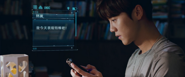 再如電影中江洋與林瀾的愛情,通過一條遲到五年的短信體現。小說中之所以用短信,是因為江南寫作那個年代是短信的年代。可《上海堡壘》設定在未來,電影中的許多技術都是超未來的,路依依拿的一個手機是全屏透明狀的,但偏偏江洋依舊拿著老人機款式的手機,用短信聊天。可信度在哪里?