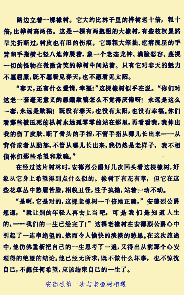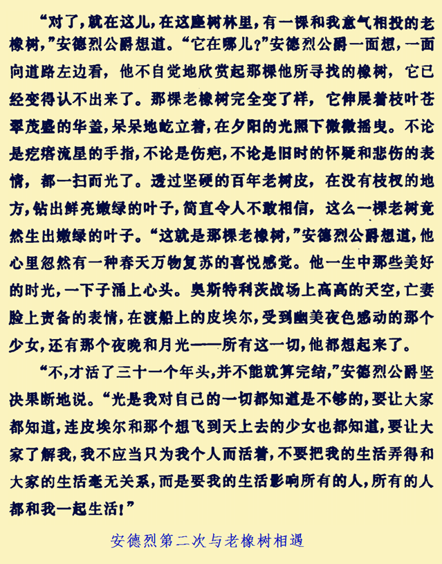 托爾斯泰善于通過描寫心理變化的過程展示人物思想性格的演變,俄羅斯文藝?yán)碚摷臆嚑柲嵫┓蛩够鶎⑦@種藝術(shù)特色命名為“心靈辯證法”。《戰(zhàn)爭與和平》中的著名片段“安德烈與老橡樹的兩次相遇”即運用心靈辯證法的方式寫出了安德烈的內(nèi)心轉(zhuǎn)變。