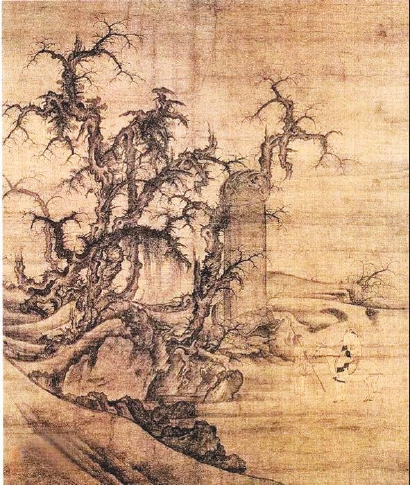 此時,除了在畫上簡單署上自己名款外,少有題記,有時甚至與觀賞者捉起迷藏,把自己的名款寫在樹干或山石之間。如范寬《溪山行旅圖》中“范寬”二字就寫在畫的右下角樹蔭下。郭熙《窠石平遠(yuǎn)圖》在畫幅左方中部用隸書小字寫了“窠石平遠(yuǎn),元豐戊午郭熙畫”。梁師閔的《蘆汀密雪圖》,其“蘆汀密雪臣梁師閔畫”的署款就落在畫幅后端中部。所有這些題跋都落在畫中不起眼的地方,也是這一時期的獨特形式。