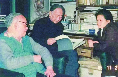 1985年11月作家彭荊風攝于沈從文家中,從左至右:沈從文、汪曾祺、彭荊風的女兒彭鴿子