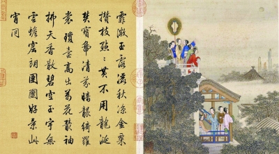 釋文: 霏微玉露灑秋晾,金粟攢枝點點黃。不用龍涎焚寶鴨,清芬暗襲綺羅裳。瓊臺高出萬花叢,袖拂天香散碧空。玉宇無云蟾窟朗,團圓好景此宵同。
