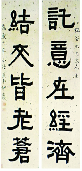 伊秉綬隸書源于漢隸,又有創新,古拙開張,融入顏體的挺拔、正直,變“蠶頭燕尾”、一波三折為沉著平直,收筆含蓄,筆法極簡,保留了篆書中段用筆,橫平豎直和帶弧度的撇捺,妙趣橫生。字形結構方正飽滿,中宮疏朗,筆畫向四周開張。