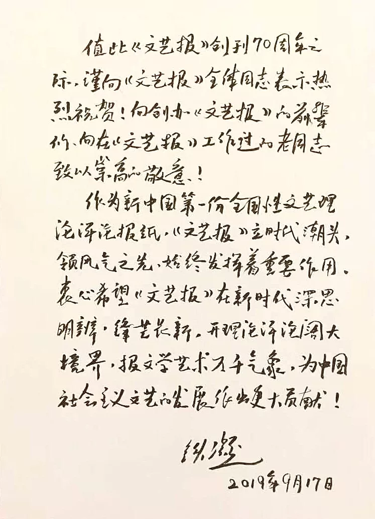 值此《文藝報》創刊70周年之際,謹向《文藝報》全體同志表示熱烈祝賀!向創辦《文藝報》的前輩們、向在《文藝報》工作過的老同志致以崇高的敬意!