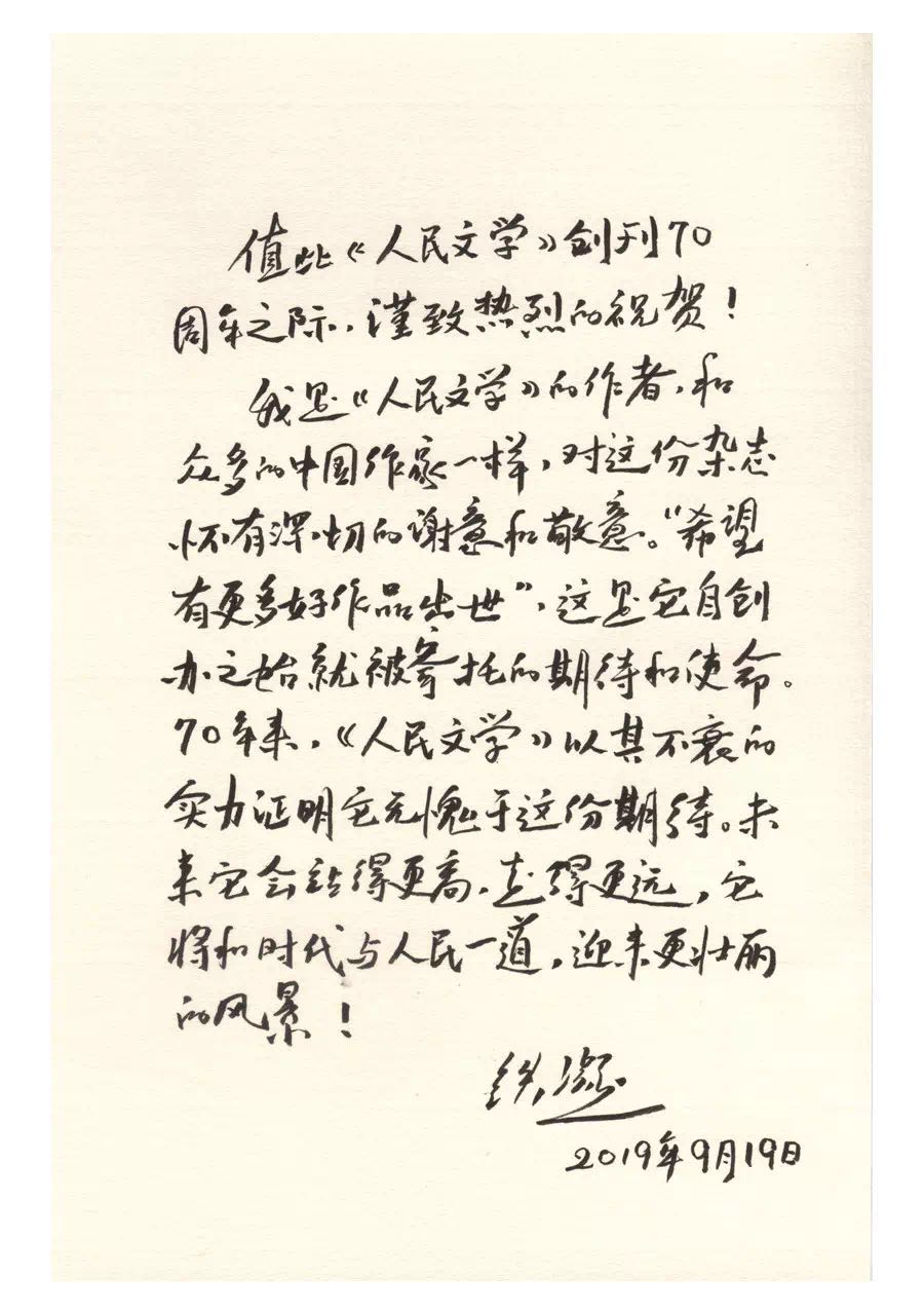 值此《人民文學(xué)》創(chuàng)刊70周年之際,謹(jǐn)致熱烈的祝賀!