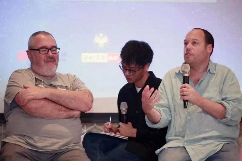 英國科幻作家伊恩·麥克唐納(左一)與以色列作家拉維·提德哈(右一)暢聊科幻