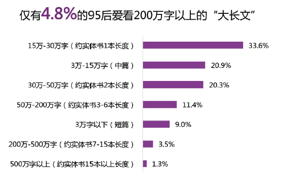 其次,輕量化的“小長(zhǎng)文”漸成網(wǎng)絡(luò)文學(xué)主流。相比于紙質(zhì)文學(xué),網(wǎng)絡(luò)文學(xué)的一個(gè)突出特點(diǎn)便是“長(zhǎng)”,曾幾何時(shí),路遙長(zhǎng)篇小說(shuō)《平凡的世界》百萬(wàn)字的篇幅已令很多 讀者望而生畏,然而如果將其放到網(wǎng)絡(luò)文學(xué) 領(lǐng)域,100 萬(wàn)字或許只能算是“短篇”。其實(shí),網(wǎng)絡(luò)文學(xué)的早期形態(tài)并不長(zhǎng),例如被譽(yù)為網(wǎng)文開(kāi)山之作的《第一次親密接觸》(痞子蔡),其總長(zhǎng)也不過(guò) 50 余萬(wàn)??梢?jiàn),網(wǎng)文字?jǐn)?shù)的長(zhǎng)并不是“先天”的,從某種意義上說(shuō),它在很大程度上是由于資本的介入與網(wǎng)絡(luò)作家分成方式而導(dǎo)致的“注水”。那么,網(wǎng)文會(huì)持續(xù)“長(zhǎng)”下去嗎?答案可能是否定 的,據(jù)統(tǒng)計(jì)(見(jiàn)圖 3),實(shí)際上僅有不足 5% 的Z世代人群愛(ài)看200萬(wàn)字以上的“大長(zhǎng)文”, 而相比之下,15—30 萬(wàn)字的“小長(zhǎng)文”成 為了“95 后”的最愛(ài)。顯然,“小長(zhǎng)文”因 體量上的“輕”而更加適應(yīng)年輕人細(xì)碎、零散的閱讀時(shí)間,當(dāng)小長(zhǎng)文迎合了 Z 世代的閱讀偏好,大長(zhǎng)文一家獨(dú)大的地位便會(huì)漸漸喪失,輕量化的網(wǎng)絡(luò)文學(xué)成為主流之日便已然不遠(yuǎn)。