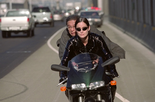 縱觀世界科幻電影史,“崔妮蒂駕駛摩托車”這一意象可謂影響深遠。許多影視作品,都會借助這種方式來塑造獨立、堅韌、帥氣的女性形象。譬如,在諾蘭導演的《蝙蝠俠:黑暗騎士崛起》(2012)中,安妮?海瑟薇飾演的貓女,一身緊身黑衣加摩托車的形象,幾乎是崔妮蒂的再現。由蓋爾?加朵飾演的吉澤爾,在《速度與激情4》中初登場時,也是騎著摩托車帥氣登場,成為一群駕駛汽車的男性角色中的特殊存在。甚至跨界到日本動畫電影界,例如《名偵探柯南》系列中,黑衣組織里的貝爾摩德、雪莉等女性成員,駕駛哈雷摩托車的鏡頭也多次出現。“女性”“黑衣”“摩托車”等,都帶有《黑客帝國》中崔妮蒂的影子。“崔妮蒂”這一人物最終突破了科幻電影的局限,成為一個永恒的經典銀幕形象。