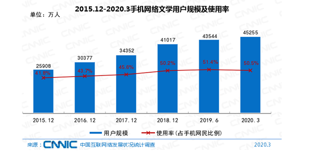 截至2020年3月,我國網絡文學用戶規模達4.55億,較2018年底增長2337萬,占網民整體整體的50.4%;手機網絡文學用戶規模達4.53億,較2018年底增長4238萬,占手機網民的50.5%。