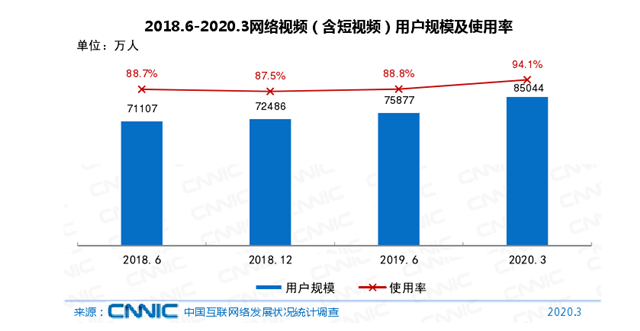 2018.6-2020.3網絡視頻(含短視頻)用戶規模及使用率