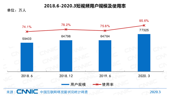 截至2020年3月,我國網絡視頻(含短視頻)用戶規模達8.50億,較2018年底增長1.26億,占網民整體的94.1%。其中短視頻用戶規模為7.73億,較2018年底增長1.25億,占網民整體的85.6%。2020年初,受新冠肺炎疫情影響,網絡視頻應用的用戶規模、使用時長均有較大幅度提升。
