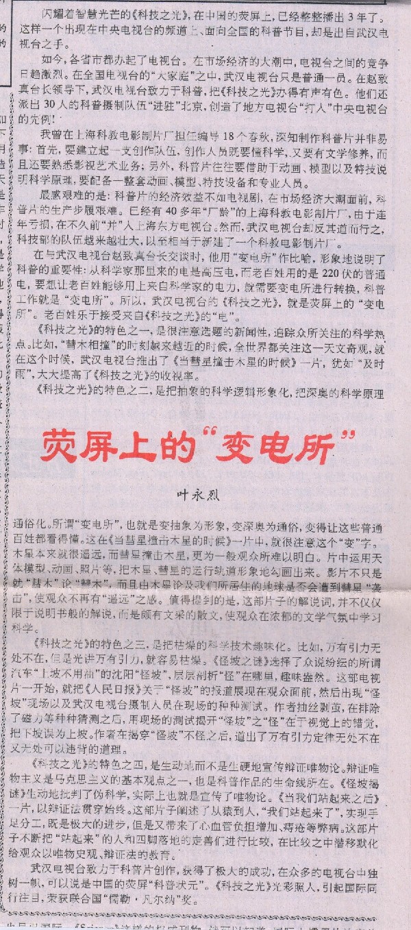 1998年5月葉永烈為祝賀《科技之光》播出三周年撰寫的文章,發表于《長江日報》