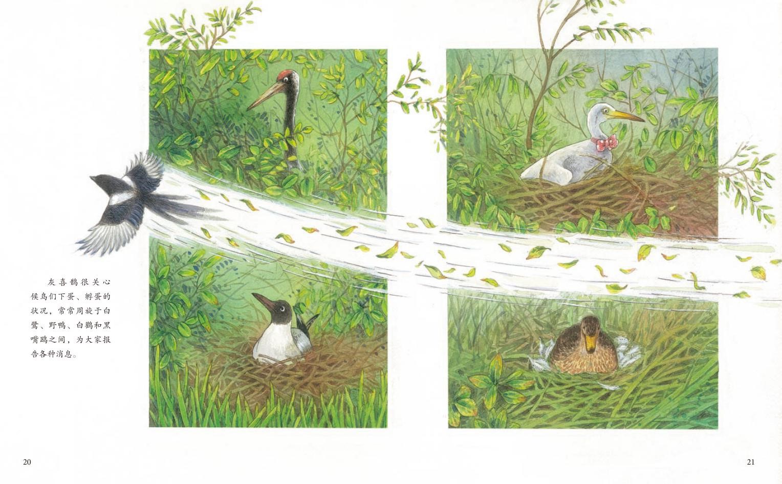 迎春花剛剛含苞待放,老白鷺早早地帶著一百多只白鷺,浩浩蕩蕩地進入了鳥類棲息地——大??跐竦亍_@片濕地始終是白鷺、綠頭野鴨、黑嘴鷗和白鸛鳥們生兒育女的搖籃。盡管濕地的空氣越來越臭,水越來越臟,食物越來越難吃,葦子蕩、槐樹林、濕草甸萎縮得越來越小,但是夏候鳥們仍一如既往地回到這里筑巢、生蛋、哺育雛鳥。意外發生了,鳥兒們下的蛋都很奇怪,根本無法孵化出來,最終,大家越過了熟悉的故鄉,去遠方尋找新的棲息地……