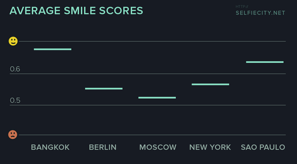以城市為單位,項目研究人員隨機收集了共3200張自拍。經過計算機的自動面部識別,以及算法對于五官位置和情緒表達的計算,研究人員得到了自拍群體的人口分布,并總結了這些照片中人們的身體姿勢和面部表情。