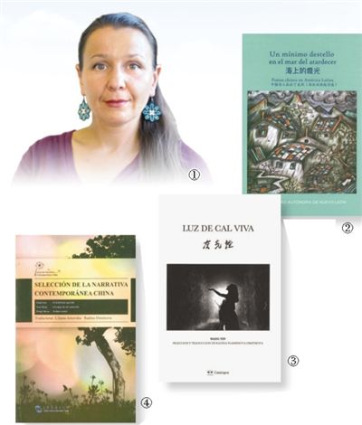 圖①:拉嫡娜。 圖②:拉嫡娜參與翻譯的西漢雙語中國當代詩歌合集詩選《海上的霞光》。 圖③:拉嫡娜翻譯的詩集《灰光燈》西班牙語版。 圖④:拉嫡娜參與翻譯的《中國當代中篇小說集》。 拉嫡娜供圖