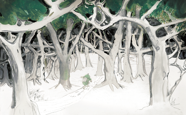 另外一位英國繪本畫家安東尼·布朗也是如此,他的繪本非常具有文學性。他講一只小熊在樹林中走,遇到各種危險,絕對不是樹林中出現(xiàn)狼或者怪物。他說恐懼的時候,每片樹葉、每棵樹干都體現(xiàn)了恐懼,當小熊脫險之后,所有的樹葉都笑了。這是一種很有趣的直觀感受,是一種非常兒童化的表達。
