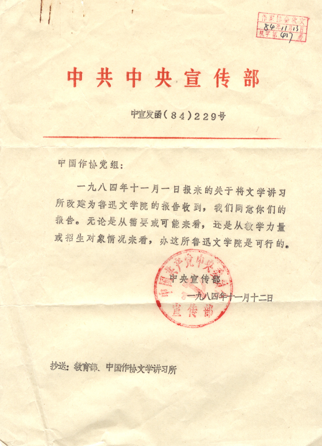 1980年代,文學事業快速發展,文學人才大量涌現,為適應新形勢下文學發展的要求,在中國作家協會的努力和黨中央的高度重視下,1980年1月,中宣部批準恢復中國作家協會文學講習所;1984年11月,文講所正式定名為魯迅文學院,由此開啟了魯迅文學院辦學和發展的新篇章。