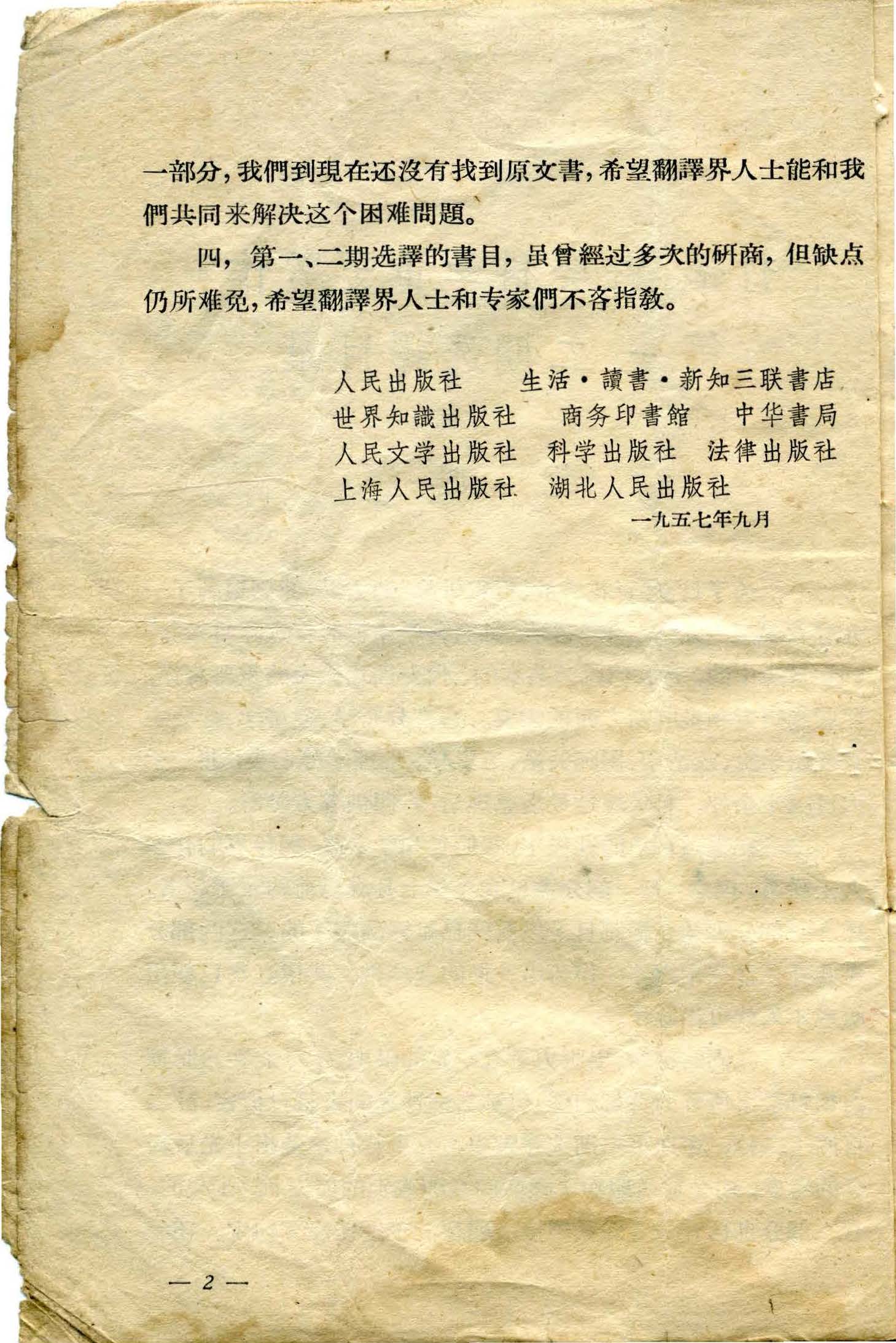 “藍皮書”雖然是由人民出版社的三聯書店編輯部編制,但它實際上是一個全國性的翻譯、出版規劃,所以,需要聯合其他出版社一道推進。筆者手頭持有的一份由人民出版社、三聯書店、世界知識出版社、商務印書館、中華書局(當時商務印書館、中華書局尚未正式獨立)、人民文學出版社、科學出版社、法律出版社、上海人民出版社、湖北人民出版社在1957年9月聯合編印的《哲學、社會科學重要著作第一、二期選譯目錄》(以下簡稱“聯合版選譯目錄”)便是這些出版社建立起來的一項工作機制,相互通報信息,共同發布消息。“聯合版選譯目錄”第一期的信息較為詳盡,標注了有關書目擬承擔的出版社和已經約定的譯者,但第二期僅列出出版社,沒有注明譯者。