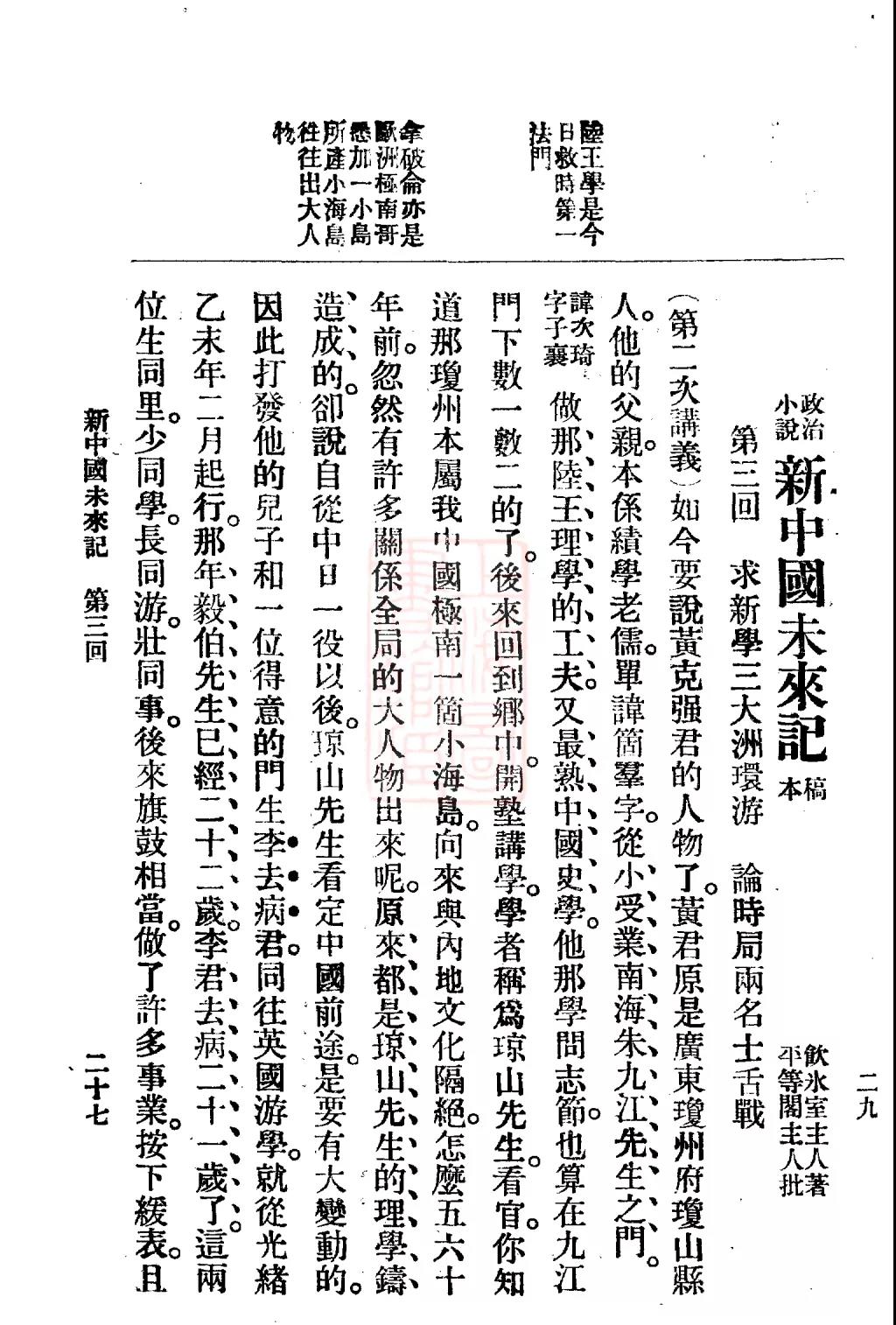 梁啟超的科幻文學活動“暴露”于1902年。是年,他不但在自己主編的《新小說》雜志連載《新中國未來記》,發表翻譯小說《世界末日記》及譯后記,還在《論小說與群治之關系》的論文中,為中國小說界革命進行布局論證。次年,他發表了翻譯小說《十五小豪杰》。