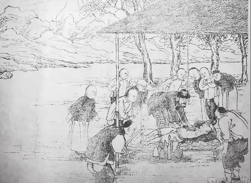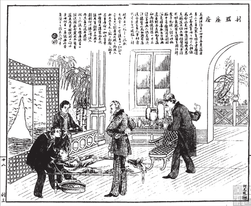 《點石齋畫報》利集三期“剖腦療瘡”配圖。《新法螺先生譚》中所描述的“旁立一人,手執一器,器中滿盛流質”場景與此圖頗為相似