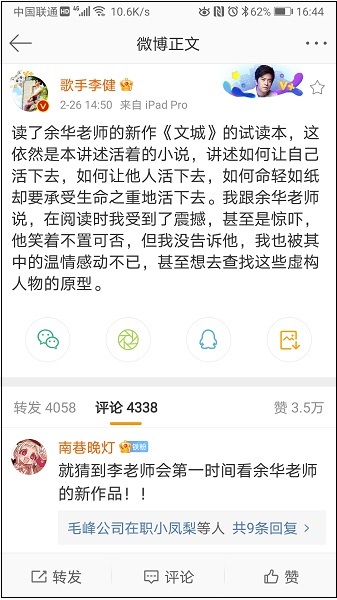 2月26日下午,李健發(fā)微博談?wù)摗段某恰贰=刂?月22日,該條微博已獲3.5萬贊,轉(zhuǎn)發(fā)、評論各4000余次。