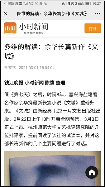 3月12日12:30復(fù)旦大學(xué)中文系副教授梁永安、巴金故居常務(wù)副館長周立民、圖書編輯蔚蔚在“周到”APP發(fā)起直播,暢聊余華長篇新作《文城》。這場直播的部分文字整理后發(fā)表于《新聞晨報》3月15日第9版。
