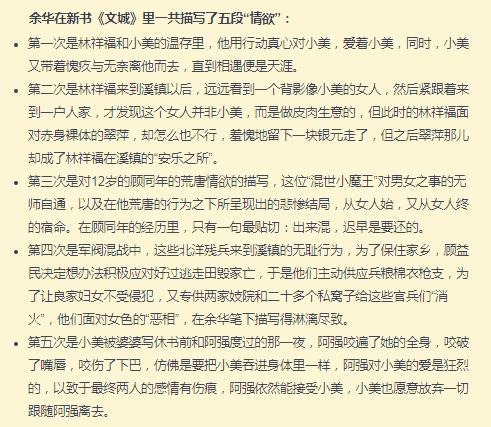 網(wǎng)易號“六秒”對《文城》細(xì)讀后,將小說中五次情欲描寫逐一列舉出來。