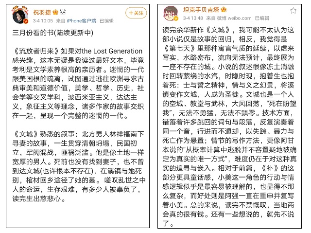 人氣作家@祝羽捷和班宇(@坦克手貝吉塔)關(guān)于《文城》的微博