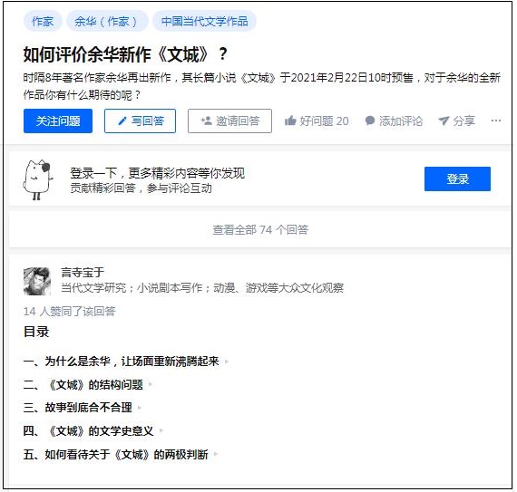 在知乎“如何評價余華新作《文城》”的問答中,已有74條長回答。圖為知乎用戶“言寺寶于”的回答。“言寺寶于”從《文城》的結(jié)構(gòu)、故事、文學(xué)史意義等角度出發(fā),并著意于作品出版后的“兩極判斷”,表達了自己的觀點。