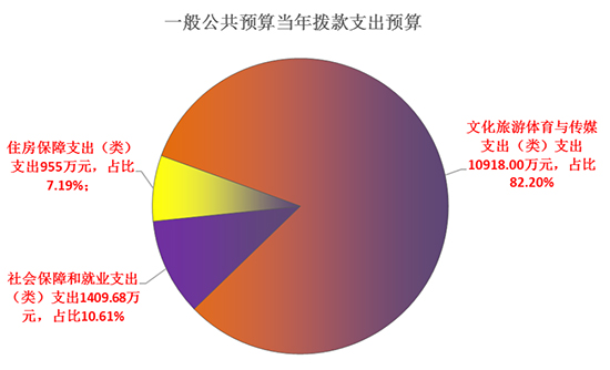 文化旅游體育與傳媒支出(類)支出10918.00萬元,占比82.20%;社會保障和就業(yè)支出(類)支出1409.68萬元,占比10.61%;住房保障支出(類)支出955.00萬元,占比7.19%。