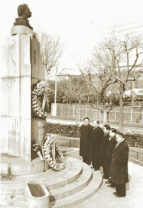 1956年,巴金(右一)等在上海向普希金紀念碑獻花。