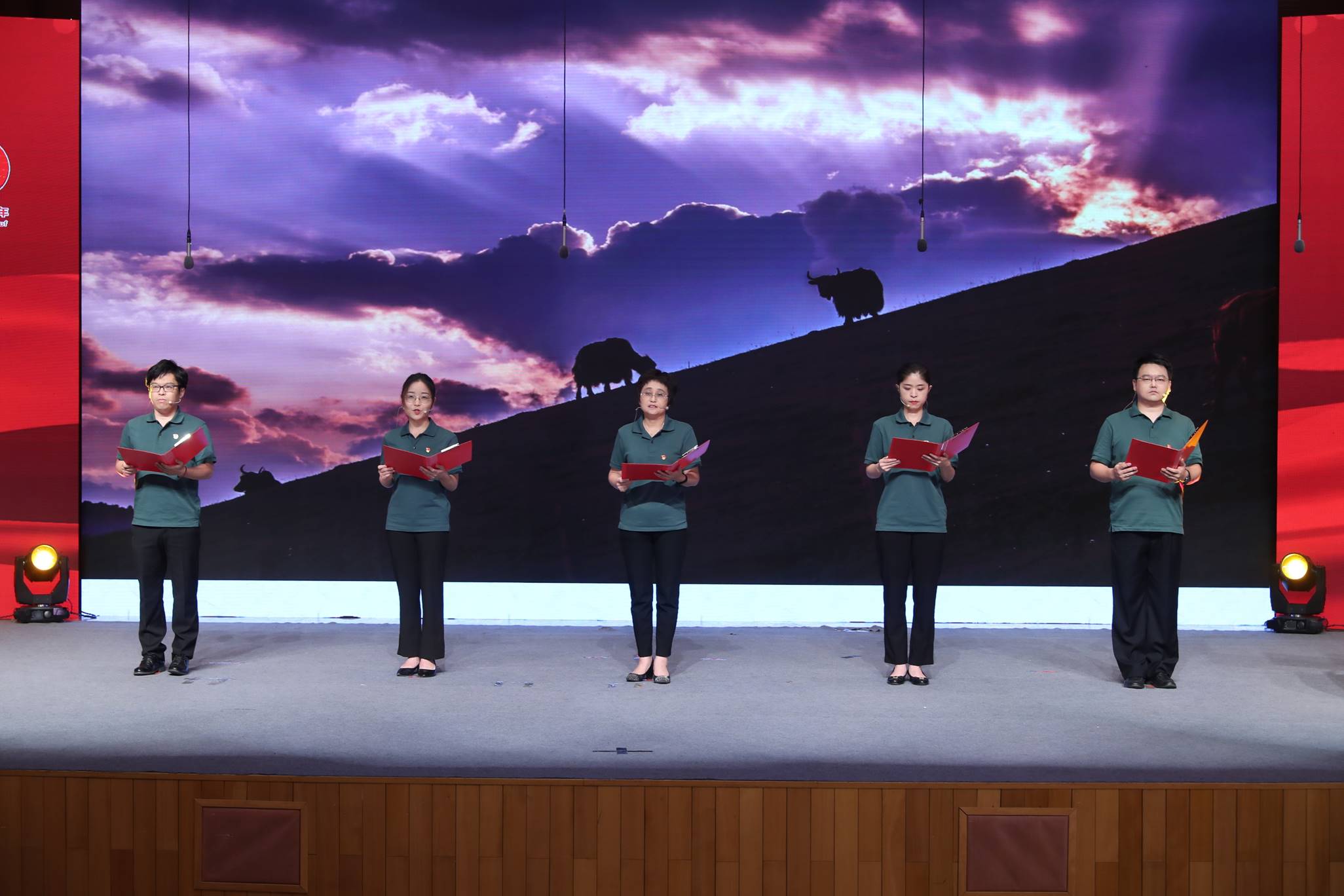 “青沉沉的大海,波濤洶涌著,潮向東方。光芒萬丈地,將要出現了喲——新生的太陽!”人民文學雜志社朗誦的高亢贊歌《太陽禮贊》拉開了朗誦會的序幕。中國作協機關黨委(人事部)朗誦的《興業路:睜開中國的眼睛——寫在黨的一大會址》、中華文學基金會朗誦的《致敬,共和國最美的身影》表現了最早一批革命播“火”者的初心與使命,以及新中國成立以來一批批最美奮斗者的偉岸身姿。中國作協創作研究部的合誦《復活的土地》、魯迅文學院的情景朗誦《黃河新頌》、中國作協網絡文學中心的合誦《有的人》、小說選刊雜志社的合誦《誰是最可愛的人》(節選)、文藝報社的合誦《回延安》、中國作家雜志社的合誦《哥德巴赫猜想》(節選)、民族文學雜志社的合誦《祖國啊,我親愛的祖國》,彰顯了一代代中華兒女為了實現國家富強、民族復興而矢志不移的精神風貌。中國現代文學館朗誦的《北京時間》、中國作協辦公廳朗誦的《祖國奏鳴曲》、中國作協社會聯絡部朗誦的《地圖上的故鄉》、中國作協機關服務中心朗誦的《飛馳吧,青春中國》、中國作協對外聯絡部朗誦的《坐上高鐵,去看青春的中國》、作家出版社朗誦的《大道陽關》、詩刊社朗誦的《為山河立傳》聚焦新時代新現實新氣象,表達出億萬人民在以習近平同志為核心的黨中央引領下踏上新征程,為實現中華民族偉大復興中國夢不懈奮斗的堅定信念。朗誦會上播放了中國作協臨潭扶貧紀錄片片段,中國作協創作聯絡部和中國作家出版集團分別朗誦了脫貧攻堅題材詩作《2020封面中國:十八洞村的笑容》《在飛機上俯瞰花鹿坪》。中國作協名譽副主席王蒙通過視頻與在朗誦會現場的青年作家共同朗誦了《青春萬歲》片段。鐵凝、錢小芊和中國作協黨組書記處同志共同朗誦了《可愛的中國》。朗誦會在大合唱《歌唱祖國》中結束,表達了中國作協干部職工對黨和祖國的熱愛贊美之情和為繁榮發展社會主義文學事業繼續努力奮斗的豪情壯志。