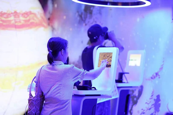 除此之外,沉浸展還有互動(dòng)裝置增強(qiáng)沉浸感和體驗(yàn)感。觀眾通過VR仿真駕駛艙第一視角體驗(yàn)流浪宇宙的恢弘感,或在“手繪小宇宙”區(qū)域,將奇思妙想化于筆下的繪畫作品,作品經(jīng)過專業(yè)設(shè)備掃描即可投影到墻面上,展現(xiàn)每個(gè)人心中的科幻宇宙。