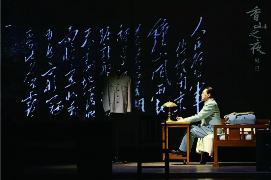 大幕拉開,扮演毛澤東的演員王斑為了練習(xí)湖南口音,朗讀了一段毛澤東在1954年中華人民共和國第一屆全國人民代表大會第一次會議上的開幕詞;全劇結(jié)尾,站在桌子后面的“毛澤東”面對臺下的觀眾,伴著強(qiáng)有力的形體動作,再次讀出這段令人熱血沸騰的宣言:“我們的事業(yè)是正義的。正義的事業(yè)是任何敵人也攻不破的。領(lǐng)導(dǎo)我們事業(yè)的核心力量是中國共產(chǎn)黨。指導(dǎo)我們思想的理論基礎(chǔ)是馬克思列寧主義。我們有充分的信心,克服一切艱難困苦,將我國建設(shè)成為一個偉大的社會主義共和國。我們正在前進(jìn)。我們正在做我們的前人從來沒有做過的極其光榮偉大的事業(yè)。我們的目的一定要達(dá)到。我們的目的一定能夠達(dá)到。”可以說,這段話不啻為這部戲的戲核。香山的那一夜是繼往開來的一個重要時間節(jié)點(diǎn),正如習(xí)近平總書記所強(qiáng)調(diào)的:歷史充分證明,中國共產(chǎn)黨和中國人民不僅善于打破一個舊世界,而且善于建設(shè)一個新世界。展望未來,中國的發(fā)展前景無限美好。