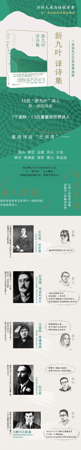 《新九葉·譯詩集》翻譯了13位殿堂級世界詩人的詩作,這些詩作涉及英語、法語、葡語、瑞典語等7個語種。詩集中收錄的外國詩人均為近200年來各國享譽詩壇的代表人物,包括葡語象征主義詩人佩索阿、庇山耶,美國詩人艾米莉·狄金森、阿什貝利,法語詩人桑德拉爾、瓦雷里、阿波利奈爾、馬克斯·雅科布,丹麥當代女詩人琵雅·塔夫德魯普,集哲學家、劇作家、外交家于一身的羅馬尼亞詩人布拉加,芬蘭瑞典語國民女詩人索德格朗,秘魯最重要的詩人巴列霍,俄國詩歌未來主義創立者馬雅可夫斯基等,旨在致敬世界詩壇,讓讀者感受世界詩歌的魅力的同時,也能夠激發漢語詩歌的創作。