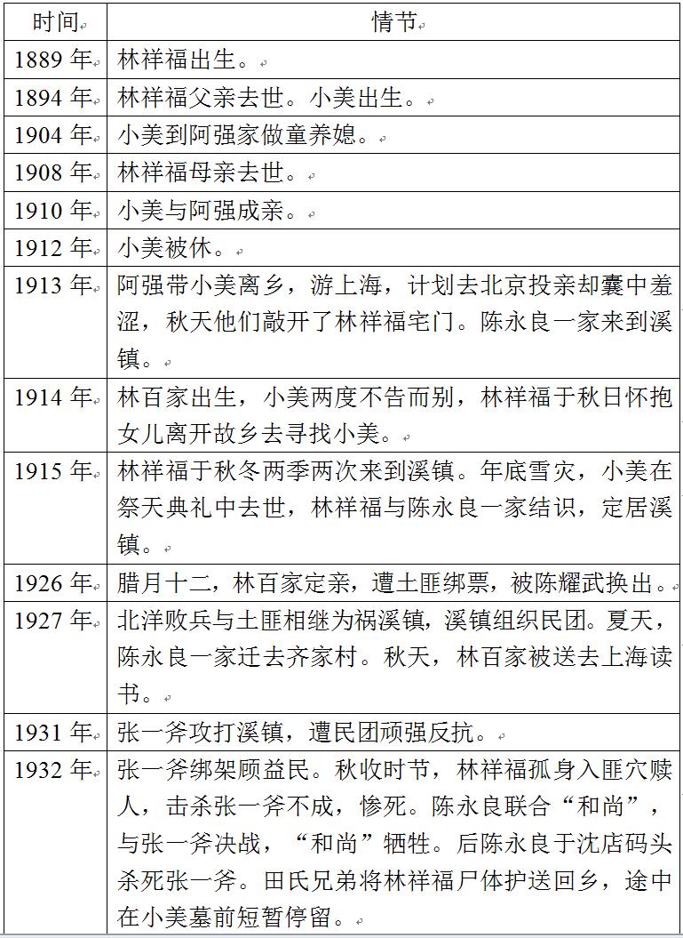 的確,《文城》里無一處提及具體年份,但若據此斷定小說背景不具備歷史與時代的精確性,就有失武斷。正因旅長到來,大歷史降臨溪鎮,讓我們有機會將這部個人精神成長的故事放置在具體歷史坐標當中。北洋軍進入溪鎮,是因為與國民革命軍交戰落敗,可知時在北伐戰爭期間。溪鎮位于長江以南600里之地,而國民革命軍與北洋軍交戰于這一區域,應在1926年底至1927年夏。當年臘月二十七,顧益民派去給土匪繳納贖金的使者因遭遇兩軍交火無功而返,其后至少過去四天,31旅長才抵達溪鎮,季節在寒冬,應未出丁卯年正月,公歷為1927年2月。此時林百家12歲整,而她又出生在夏天,可知林百家生于1914年。這一年林祥福25歲,則他與李大釗、劉文典同齡,生在1889年。由此,《文城》的時間表(見表1)可謂一清二楚。