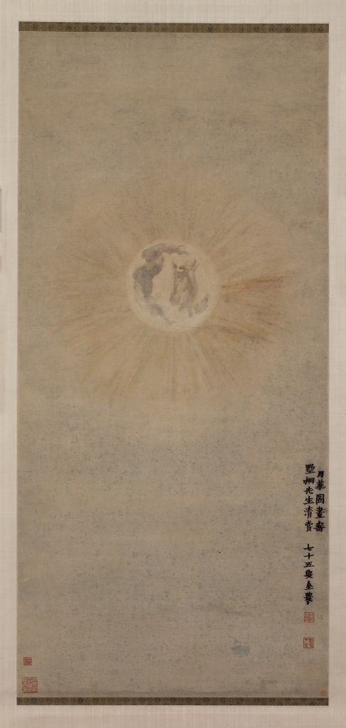 此圖是金農(nóng)晚年畫贈(zèng)友人之作。全畫中只有一輪滿月,里面是凹凸起伏的陰影,外緣放射出赤橙黃綠青藍(lán)紫組成的光芒,畫面賦色簡逸純凈?!对氯A圖》的構(gòu)思則別出心裁,以寫實(shí)的手法直接表現(xiàn)月亮的光華,以奇致勝。此圖畫法上幾乎看不到傳統(tǒng)的筆墨之法,陰影的表現(xiàn)充分發(fā)揮了水墨在宣紙上產(chǎn)生的效果,與暖色調(diào)的淡色光芒形成對(duì)比,襯托出月光的皎潔明亮。張庚在《國朝畫征錄》曾評(píng)金農(nóng)畫道:“非復(fù)塵世所見,蓋皆意為之?!贝藞D可謂前無古人,后無來者。