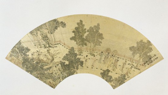 畫作上并無作者款印。對(duì)幅為清耿昭忠墨題:“風(fēng)格高玅飄飄然,有凌霞絕塵之姿,是蓋周文矩胸中廻出天機(jī),故落筆超乎物表,張、吳、顧、陸何難繼踵。襄平耿昭忠題。”此圖舊簽題以及對(duì)幅耿昭忠的題記均言作者是五代周文矩。周文矩受南唐后主李煜顫筆書法的影響,喜以瘦挺顫掣的筆法入畫,線條多轉(zhuǎn)折頓挫,剛中有柔。此圖線條工謹(jǐn)精細(xì),如春蠶吐絲,柔中見剛,與周文矩的用筆特點(diǎn)不符,因此,它應(yīng)是宋代佚名畫家所作。